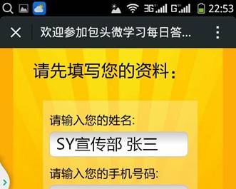 二、首次进入“金榜”“闯关答题”栏目时,需先注册个人信息,“姓名”一栏需填写“识别编码+单位名称(建议使用常用简称)+本人真实姓名”。金沙官网识别编码为KD。如:包头师范学院宣传部 张三,需在“请输入您的姓名”中填写“SY宣传部张三”。如: