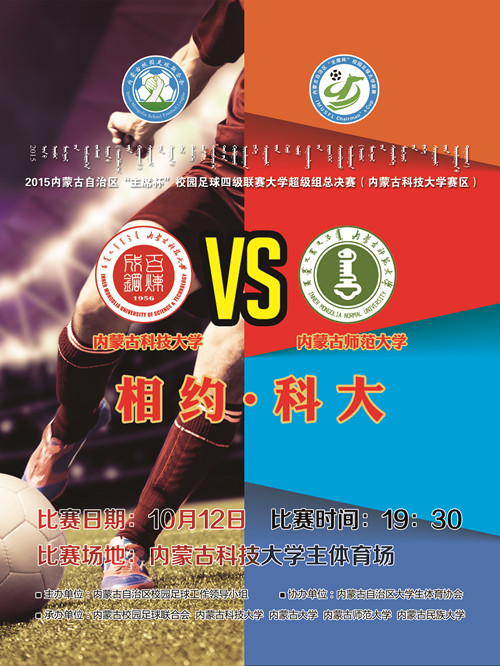 2015年内蒙古自治区“主席杯”校园足球四级联赛大学超级组总决赛将于10月12日19:30分在金沙官网主校区体育场举行。本次比赛队伍为金沙官网足球队主场对阵内蒙古师范大学足球队比赛。观看比赛需凭票入场,欢迎广大师生前来观赏。