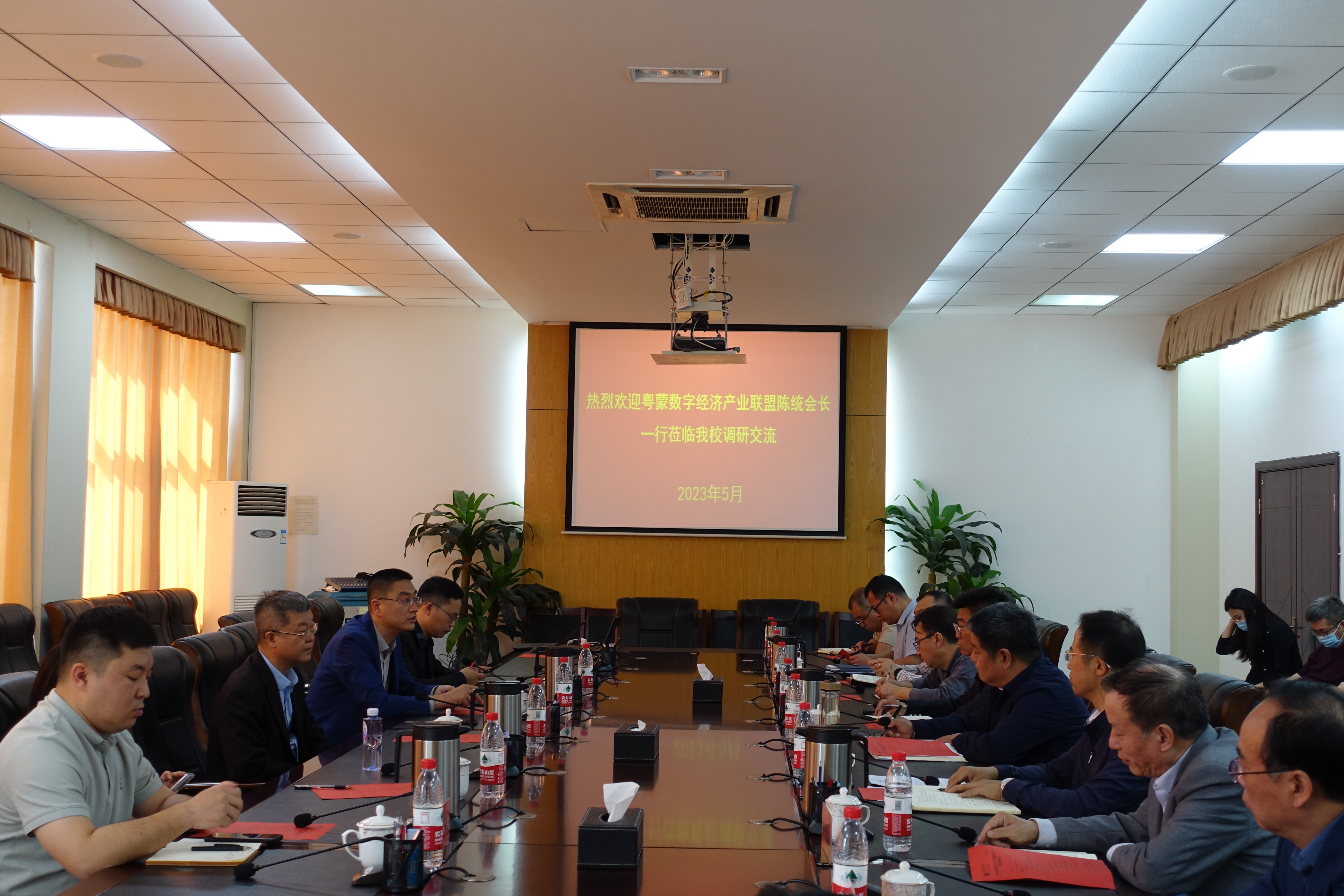 5月11日上午,粤蒙数字经济产业联盟陈统会长一行来校调研交流。校党委副书记冯志强参加座谈会。