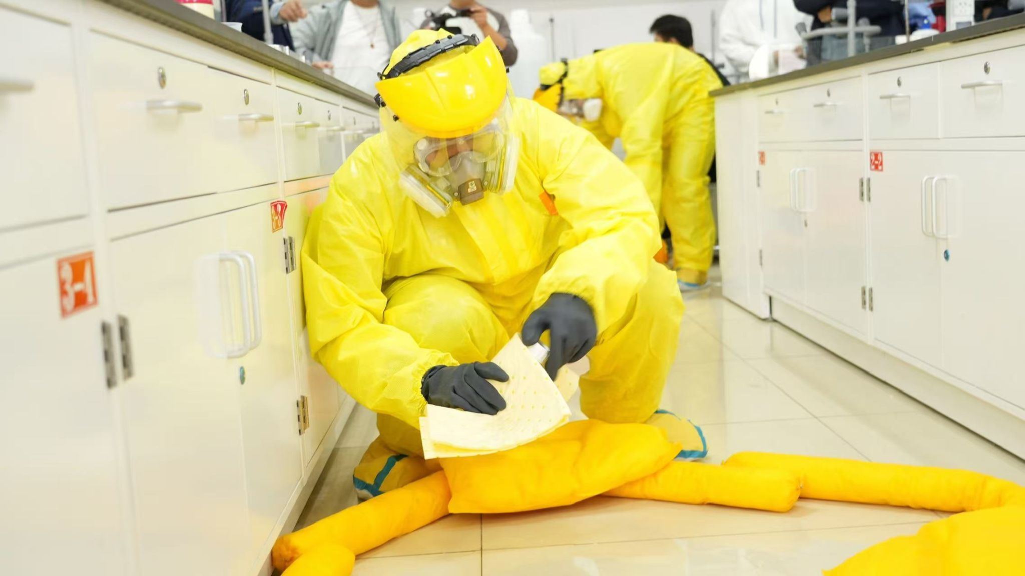 安全演练模拟了化学药品意外倾倒、人员受伤等情况发生后伤情救治、设备使用、人员疏散、现场封锁、事故上报、清理安置等多环节的处置流程和方法。整个演练过程紧张有序、参与充分。