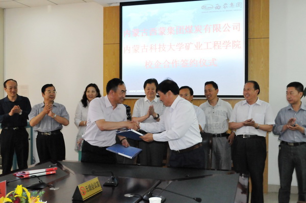 矿业学院院长张金山与内蒙古西蒙煤炭责任公司陈涌总经理分别代表学院和公司在合作协议上签字。