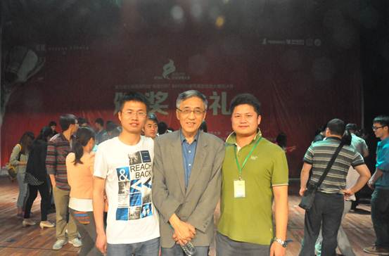 金沙官网学生曾振浩、王杰与中国建设教育协会副秘书长徐家华(中)在颁奖典礼上的合影