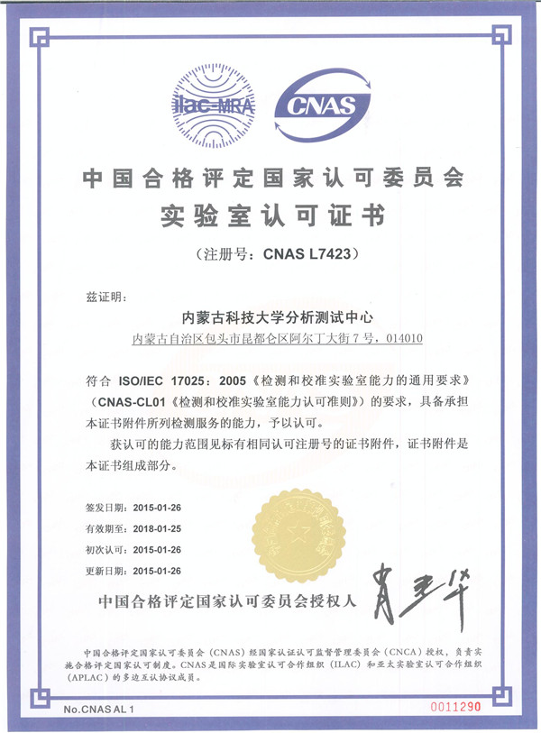 1月26日,中国合格评定国家认可委员会(简称CNAS)正式向金沙官网分析测试中心颁发实验室认可证书。