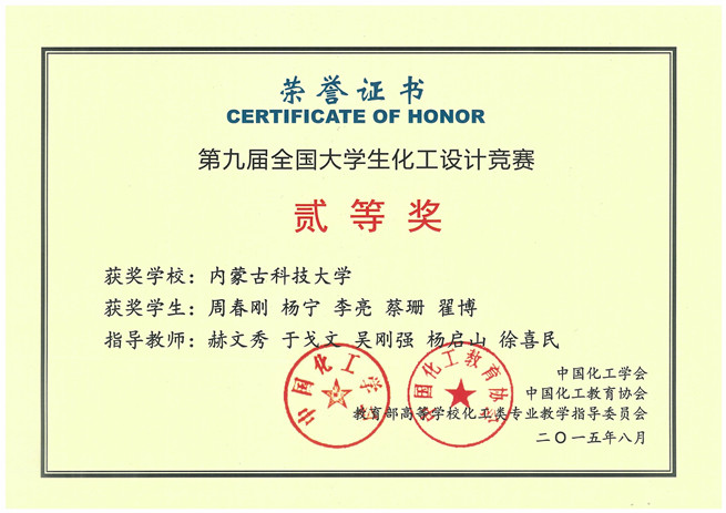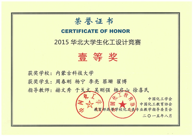 11月9日,化工学院收到由中国化工学会寄来的获奖证书,由金沙官网化工学院学生组成的“鹿坪”代表队,在2015年第九届“东华科技-三井化学杯”全国大学生化工设计竞赛华北地区预选赛中荣获全国二等奖和华北赛区一等奖。