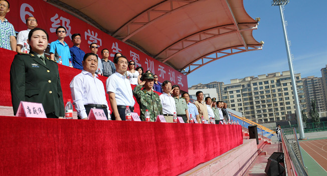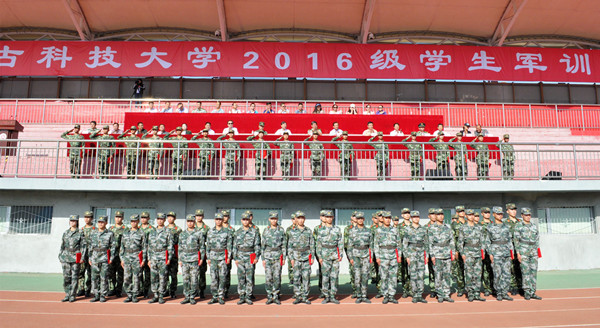 9月5日上午,金沙官网2016级学生军训开训式在学校田径场隆重举行,包头军分区参谋长李虎大校、武警包头市支队参谋长伊永夫中校、包头市昆区人民武装部政工科科长孙铭耀中校出席开训式。