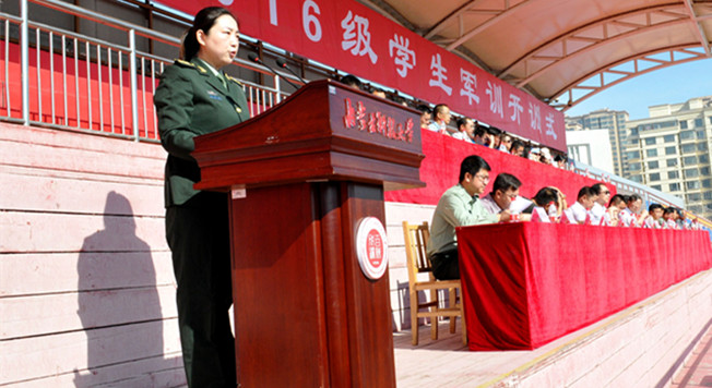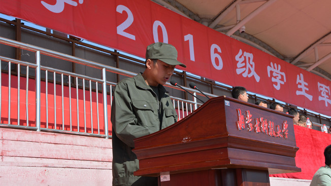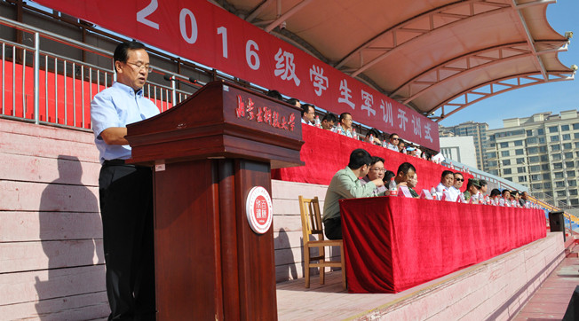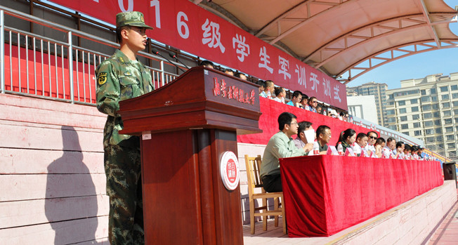 2016级学生军训团团长郭中旗代表军训教官讲话,并希望通过军训提高学生的国防意识,增强体魄,打下坚实的基础,迎接新挑战。