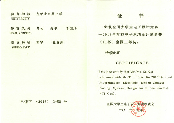 9月2日至9月6日,第四届“TI杯全国大学生电子设计竞赛模拟电子系统专题邀请赛”在东南大学顺利落幕。经过几天的激烈角逐,金沙官网信息学院学生吴宇、李国烨、苏楠获得大赛全国三等奖,郭宇和张春燕两位老师为赛前指导教师。