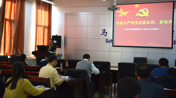 马克思主义学院金海斌老师作了《全面从严治党的新征程新境界》主题报告,金老师从十八届六中全会书写了全面从严治党的新篇章、《关于新形势下党内政治生活的若干准则》的新提法和新亮点、关于《中国共产党党内监督条例》的新提法和新亮点、全面从严治党永远在路上”四个方面为大家解读了十八届六中全会精神。