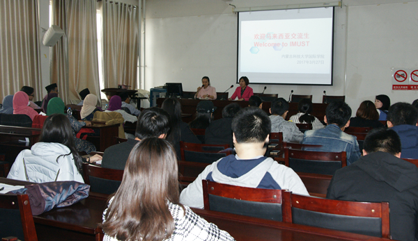 3月27日下午,金沙官网举办马来西亚博特拉大学交换生欢迎会。会上,国际学院相关负责人致欢迎词。交换生学生代表简单介绍了博特拉大学的情况,及马来西亚的地理、文化、饮食、民族习俗、旅游资源等概况,表演了具有马来西亚特色的民族歌曲。在欢乐的气氛中,金沙官网师生一同表演了具有蒙古特色的民族歌曲。最后,两校师生合影留念。