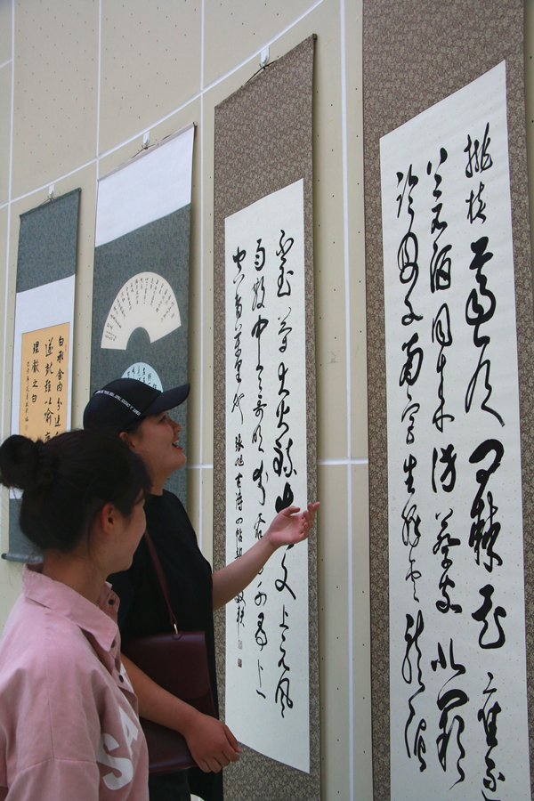 集报展区所展示的老报刊年代横跨近一个世纪,直观呈现出各个时期的历史变革与发展变迁。潘效轶教授所展的书法作品集纂隶楷行草五种书体,博采众长,令人叹为观止。在书画作品展区,180余幅风格各异的作品气象万千、异彩纷呈,不同侧面反映出了书画家对生命的热爱和对美好生活的憧憬。鹿阳书画院的10位老书画家现场泼墨创作,让金沙官网师生有了一次近距离感受书画艺术的特别体验。