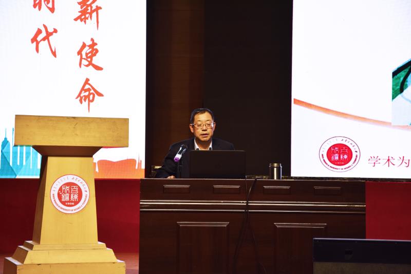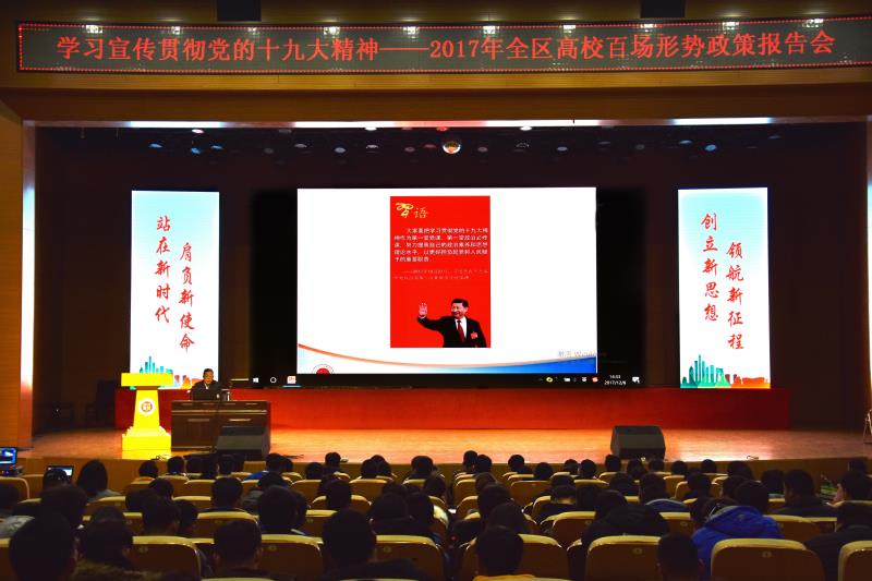 为进一步学习宣传贯彻党的十九大精神,引导广大青年学生自觉用习近平新时代中国特色社会主义思想武装头脑、指导行动,12月8日下午,“学习宣传贯彻党的十九大精神 2017全区高校百场形势政策报告会”在金沙官网举办。金沙官网文法学院院长、教授委员会主任朱海珅教授作了以《站在新时代、肩负新使命、创立新思想、领航新征程——十九大报告关键词“新”之解读》为主题的报告,为金沙官网在场的500余名师生深层次、多角度、全方位解读了党的十九大报告。报告会由校团委书记韩冰主持。