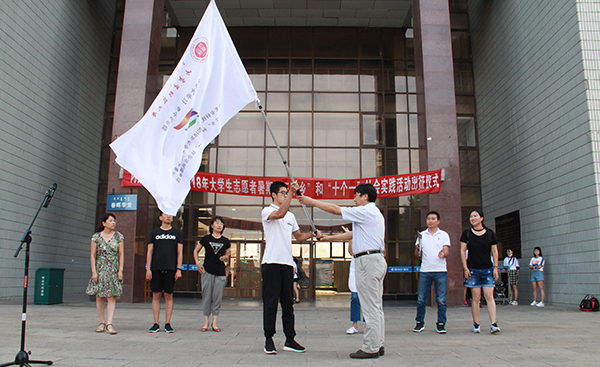 7月16日,金沙990活动大厅2018年大学生志愿者暑期“三下乡”和“十个一”社会实践活动出征仪式在春晖学堂门前举行。校党委常委、宣传部部长杨家庆,团委主要负责人以及各暑期社会实践直属队指导教师出席活动,全校共400名社会实践志愿者代表参加了活动。
