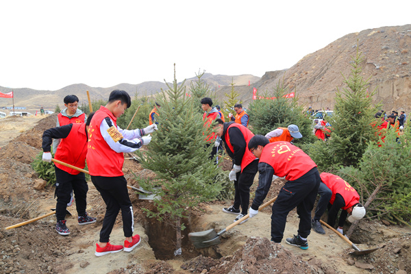 植树地点位于石门风景区,一到植树现场,大家就拿起自带的铁锹、手套等劳动工具,自行分组开始忙碌。身穿志愿者服装的老师同学们挥锹铲土、扶苗定植、两两配合,远远看去一片繁忙有序的劳动景象。付出一分辛苦,收获一份希望。经过大家的辛勤劳动,100余棵树苗迎风而立,师生纵情挥洒汗水,脸上绽放欣慰笑容。