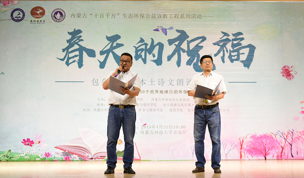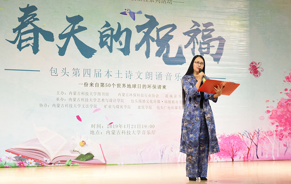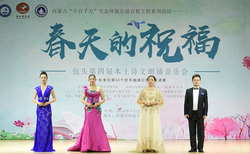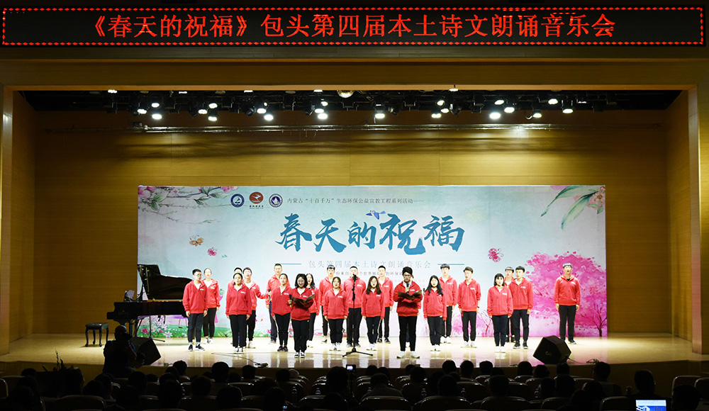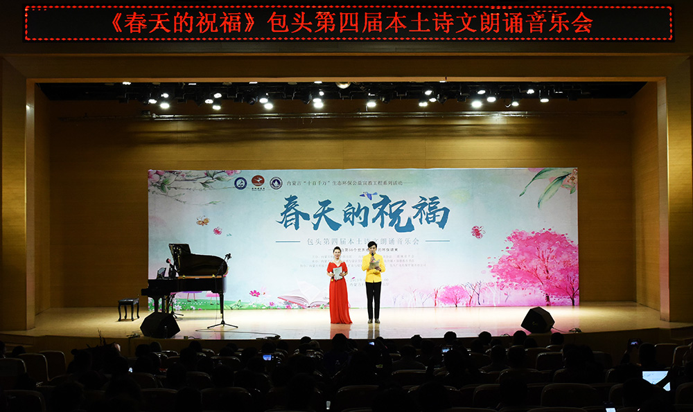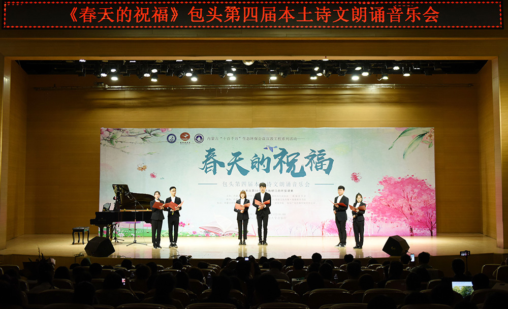 “春天的祝福”---包头第四届本土诗文朗诵音乐会为校内外广大作者、读者、朗诵者、演唱者创造了相互交流学习、借鉴指导的机会,现场400余名观众,在朗诵和音乐中进一步感受到了艺术的魅力、读书的魅力、生态保护的魅力!本次诗文朗诵音乐会是“金沙990活动大厅第十四届读书宣传月”系列活动、内蒙古“十百千万”生态环保公益宣教工程系列活动之一,由金沙990活动大厅图书馆、内蒙古环保科技行业协会、鹿城读书会主办。