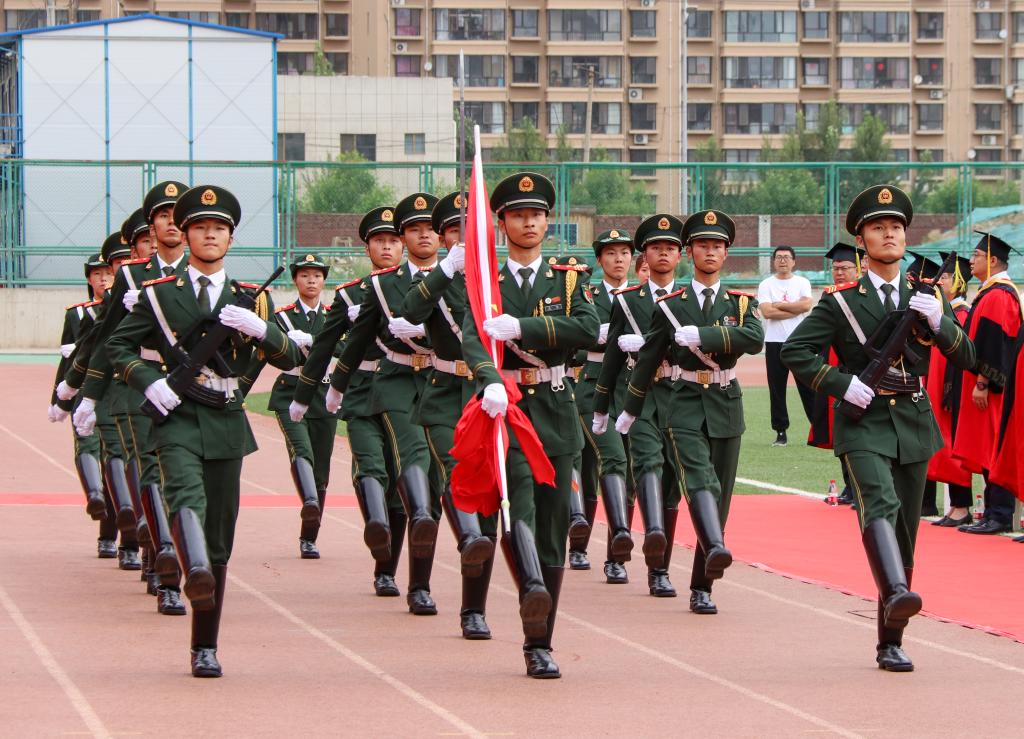典礼伊始,国旗护卫队护送国旗入场,在场人员全体起立,伴随着雄壮的《义勇军进行曲》,鲜艳的五星红旗冉冉升起,拉开了毕业典礼的序幕。