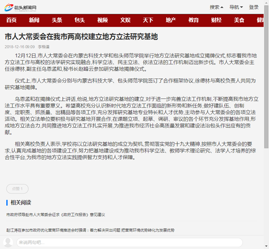 12月12日,市人大常委会在金沙990活动大厅和包头师范学院举行地方立法研究基地成立揭牌仪式,标志着我市地方立法工作与高校的法学研究实现融合,科学立法、民主立法、依法立法的工作机制迈出新步伐。市人大常委会主任徐德林,副主任乌恩孟和,秘书长赵峰云参加研究基地揭牌仪式。