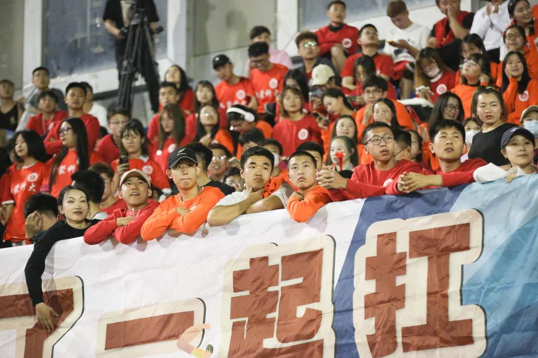 内蒙古大学生校园足球联赛本科超级组男子组比赛现场,观众席上坐满了前来观赛的同学